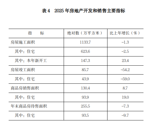 全区房屋施工面积1133.7万平方米,比上年下降1.3%。其中,本年新开工面积147.3万平方米,增长23.4%。全年房屋竣工面积85.7万平方米,下降54.2%。全年商品房销售面积130.4万平方米,增长8.7%。