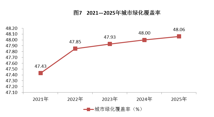 全区城市绿化覆盖率为48.06%,比上年提高0.06个百分点。人均公园绿地面积12.79平方米,比上年增加0.35平方米。
