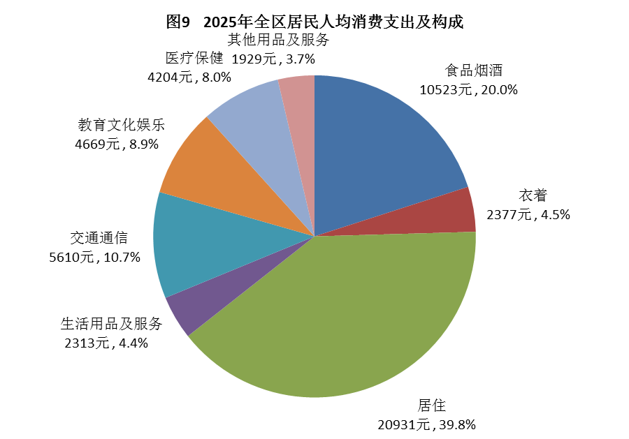 全年全区居民人均消费支出52556元,比上年下降1.3%。恩格尔系数为20.0%,比上年下降1.3个百分点。