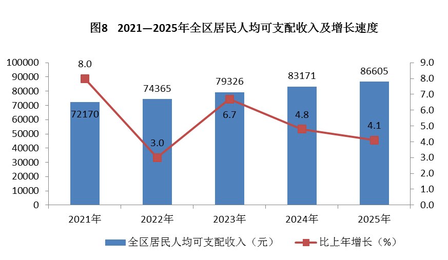 人民生活:全年全区居民人均可支配收入86605元,比上年增长4.1%。从收入构成看,人均工资性收入53660元,增长5.3%;人均经营净收入1256元,增长2.6%;人均财产净收入11466元,增长2.9%;人均转移净收入20223元,增长2.1%。